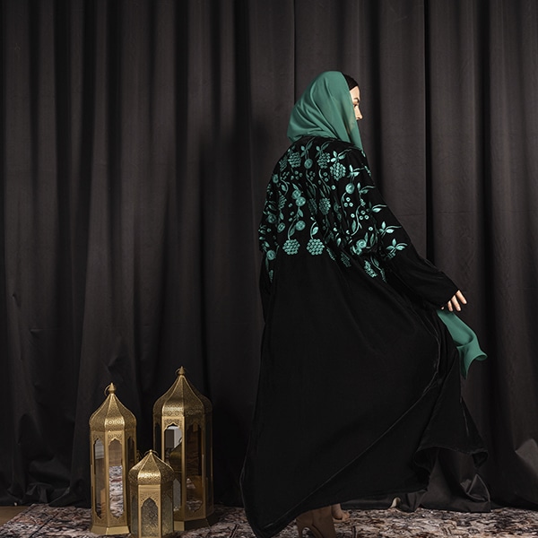 Alexandrite Abaya : bahraini cut Abaya with hand embroidery flowers on upper back and front with details in hands , Douja Leil Sheila included 2 yard