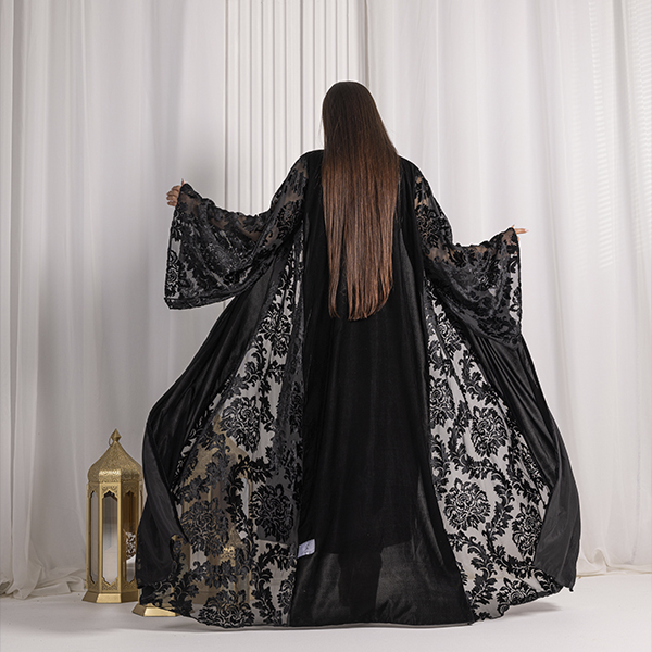 Flint Abaya : A cut Abaya in silk Italian velvet Fabric with Flowery velvet fabric on sleeves and sides