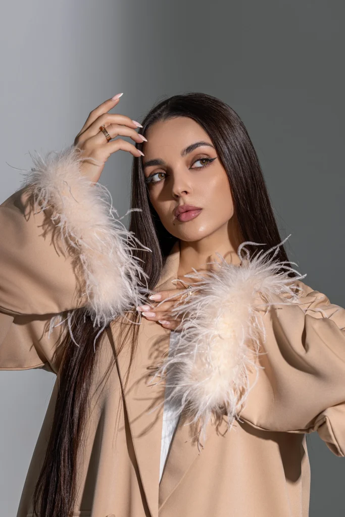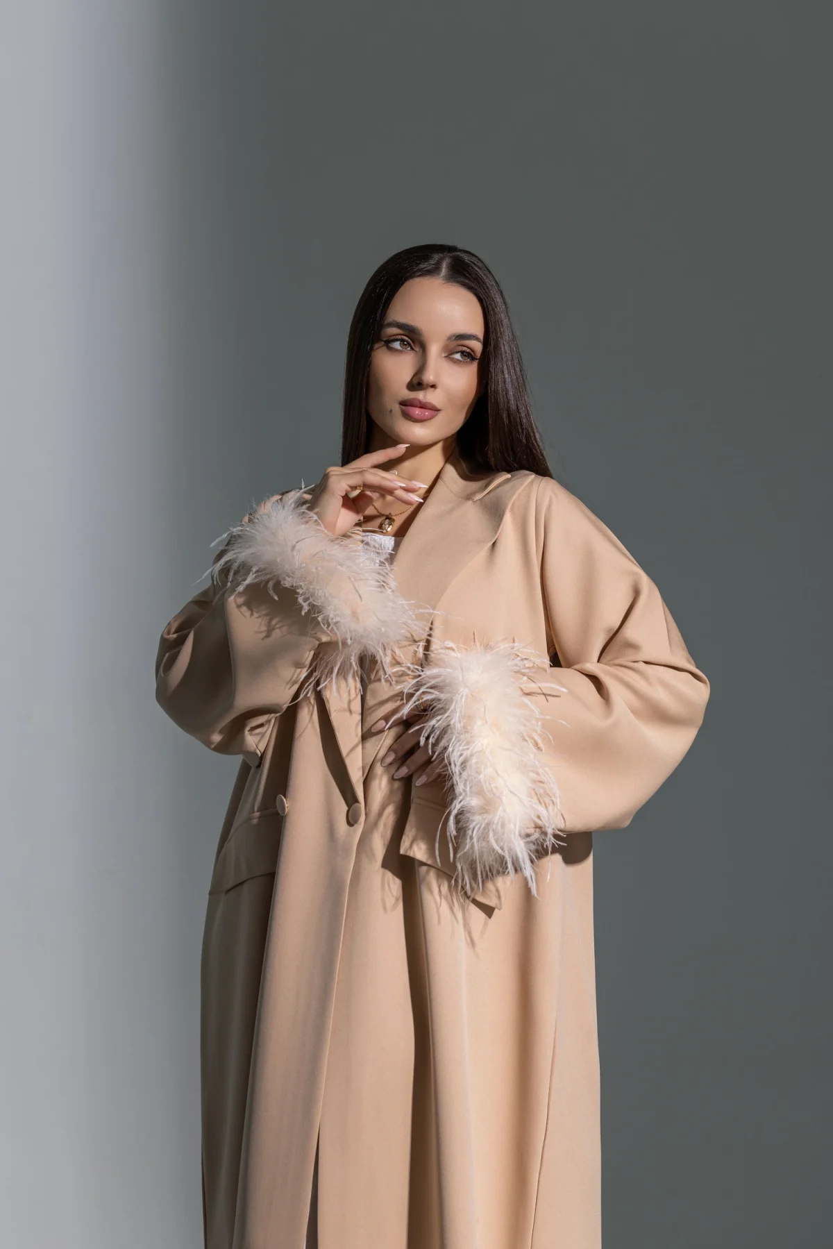 Rhodonite Abaya : coat Cut straight Abaya in Saudi crepe fabric, with fur in sleeves and detailed buttons in front